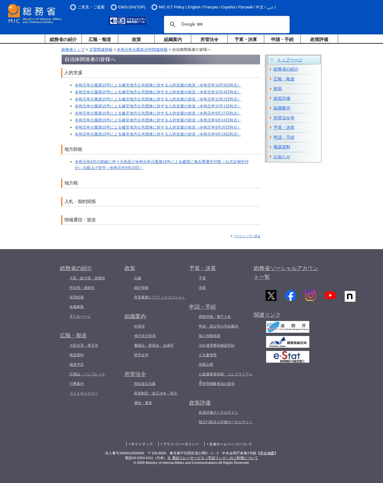 このページは、総務省が自治体関係者向けに提供する令和元年台風第15号関連情報をまとめたものである。被災地方公共団体への人的支援の状況を9月19日から10月9日まで複数時点で報告し、その推移を記録している。また、地方財政面では8月の前線に伴う大雨と台風第15号による被害に対する普通交付税の繰上げ交付についての情報を掲載。地方税、入札・契約、情報通信・放送関連の支援情報も提供している。自治体が災害対応を進める際に必要な支援情報を一元的に提供するページとなっている。