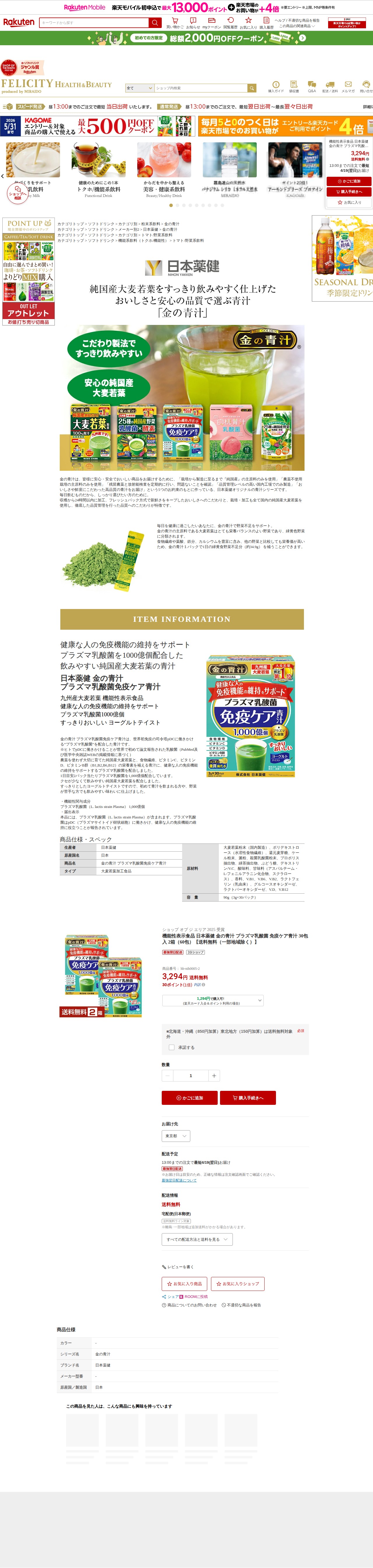 【楽天市場】機能性表示食品 日本薬健 金の青汁 プラズマ乳酸菌 免疫ケア青汁 30包入 2箱(60包)【送料無料(一部地域除く)】:FELICITY Health&Beauty - 保存されたスクリーンショット