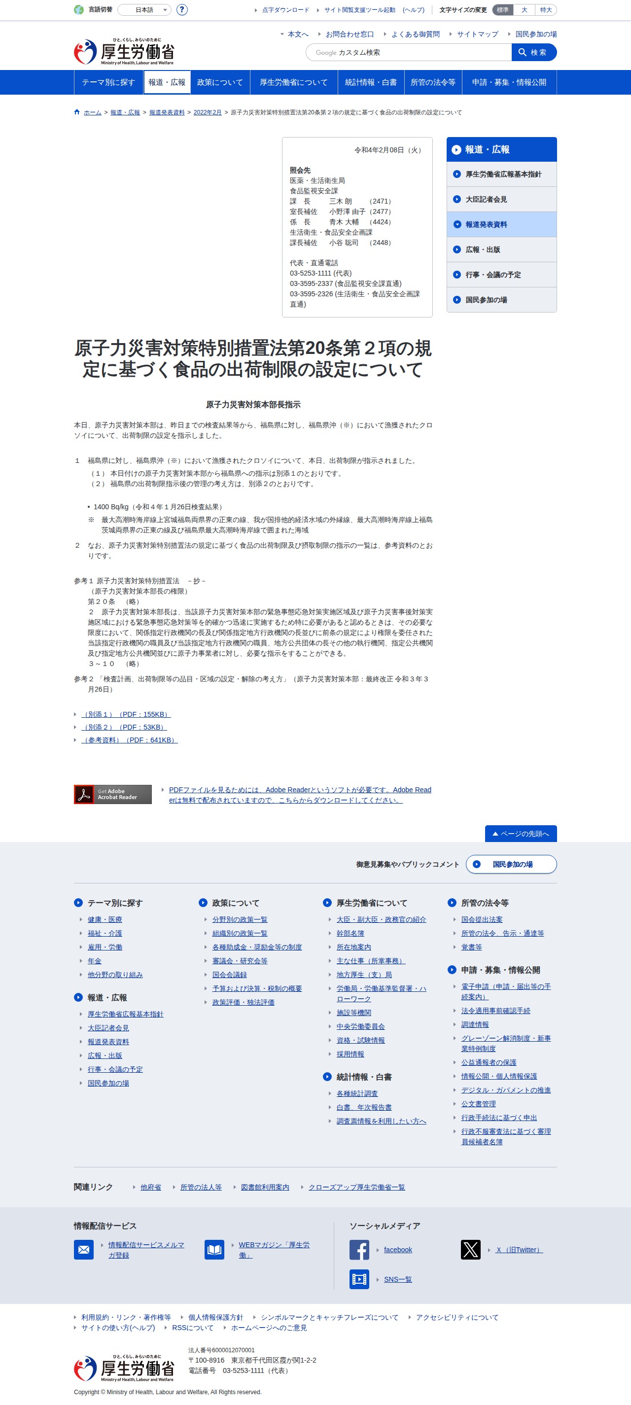 原子力災害対策特別措置法第20条第2項の規定に基づく食品の出荷制限の設定|厚生労働省