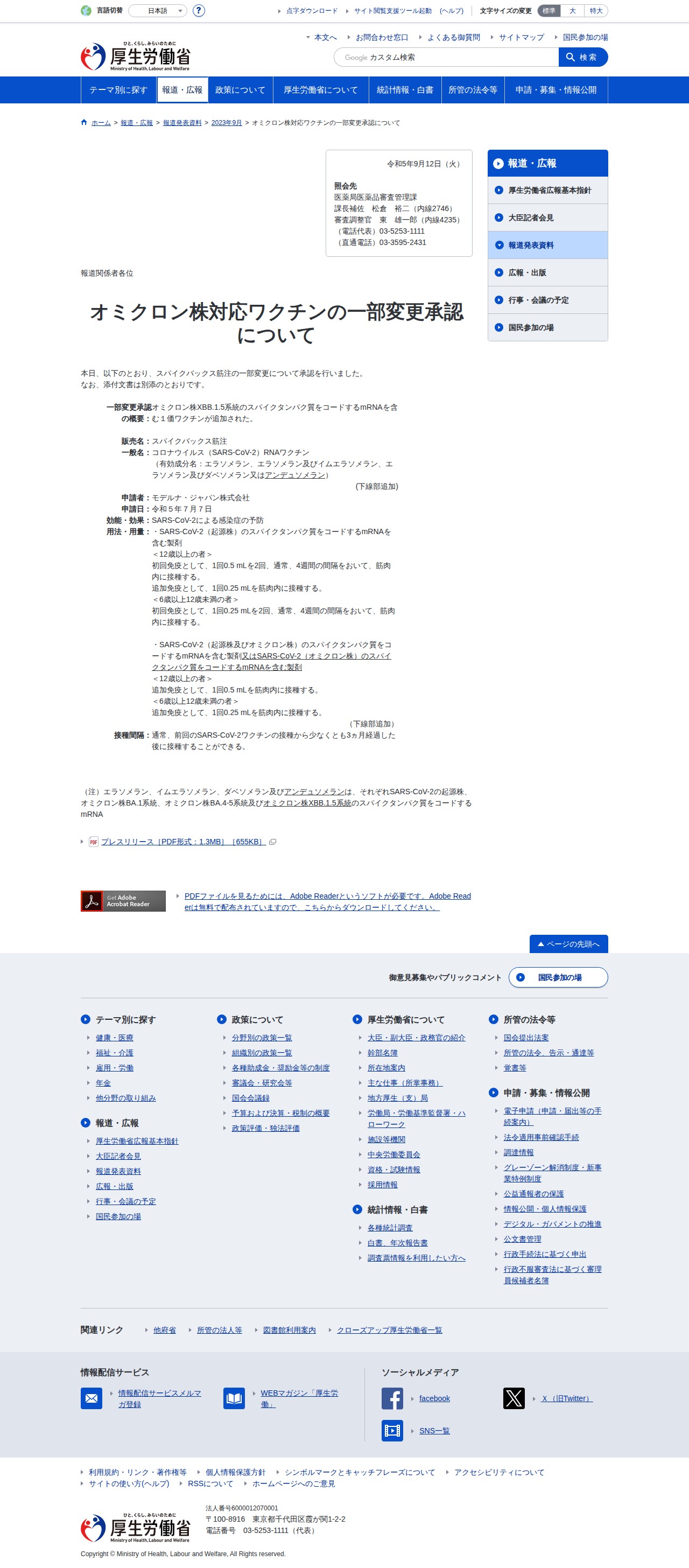 このページは、厚生労働省が2023年9月12日に公表したオミクロン株対応ワクチンの承認についての報道発表です。モデルナ社のスパイクバックス筋注について、オミクロン株XBB.1.5系統のスパイクタンパク質をコードするmRNAを含む1価ワクチンが追加承認されました。12歳以上の追加免疫接種では0.5mL、6~12歳未満では0.25mLの接種量が定められており、前回接種から3ヶ月以上経過後に接種可能です。
