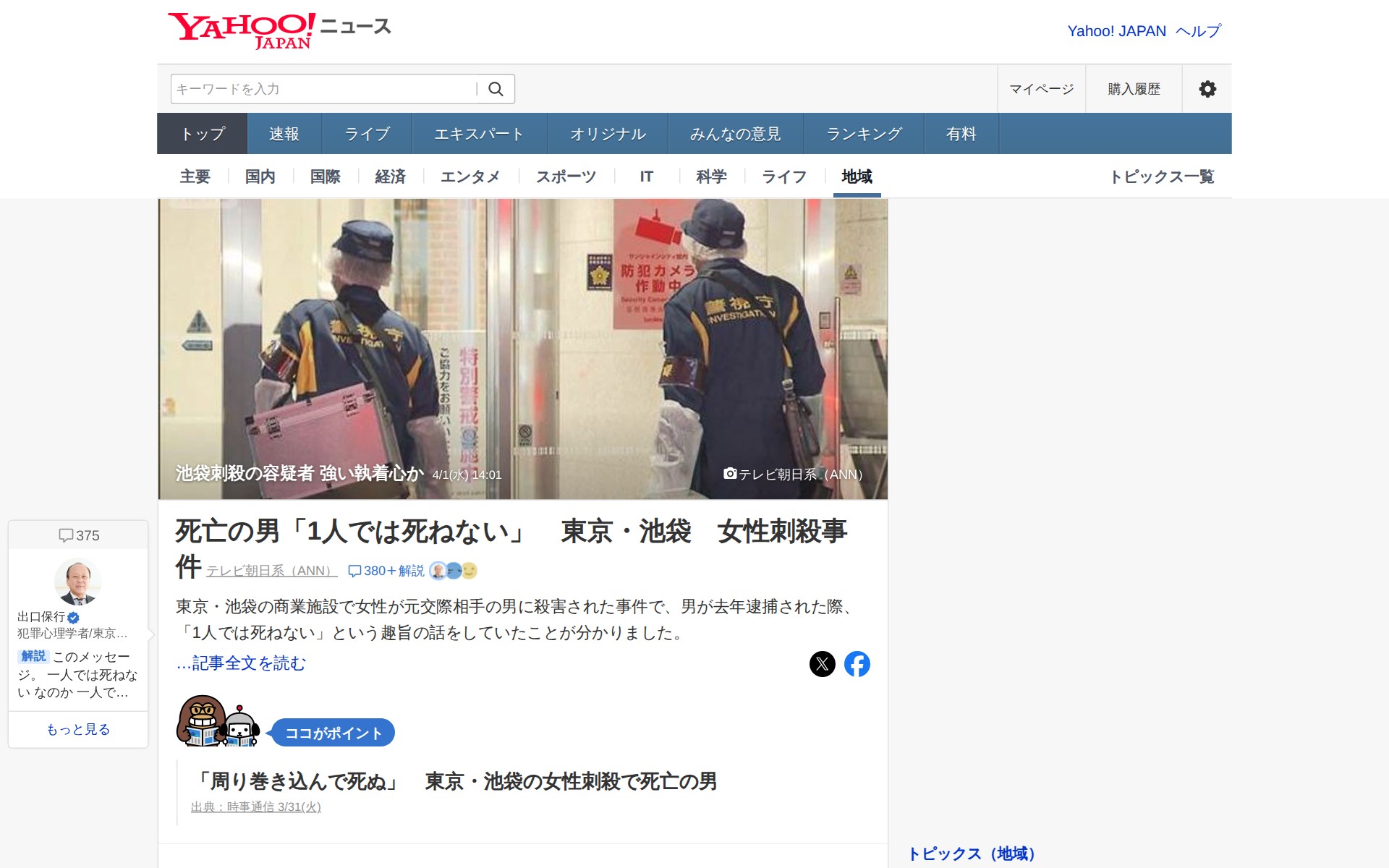池袋刺殺の容疑者 強い執着心か - Yahoo!ニュース - 保存されたスクリーンショット