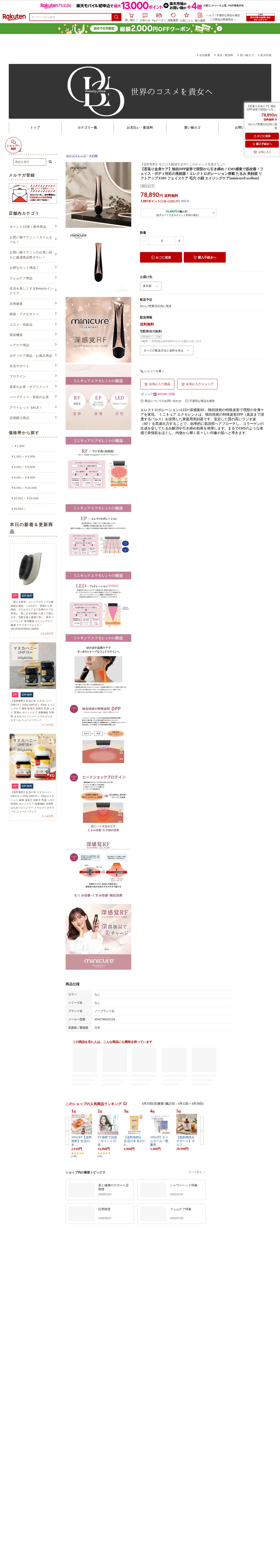 このページは、楽天市場で販売されている美顔器「minicure Excellent」の商品紹介ページです。独自のDPP波形技術を搭載した家庭用美顔器で、エレクトロポレーション、LED、ラジオ波を組み合わせています。顔と身体の両方に対応し、深部の肌にアプローチしてコラーゲン生成を促進し、たるみ解消や引き締め効果を実現します。EMS感覚で表情筋をほぐし、若々しい肌へ導きます。価格は78,890円で送料無料、5~7営業日以内に発送されます。