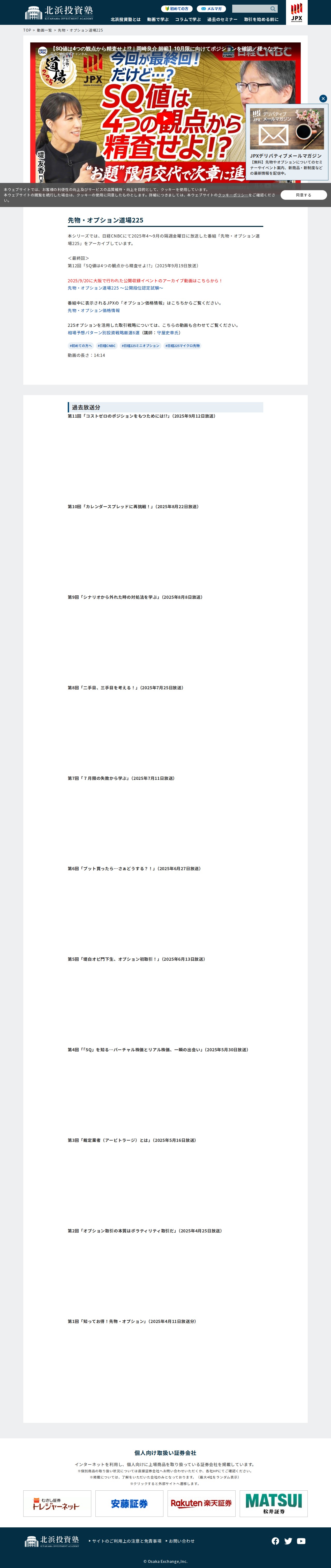 このページは、大阪取引所が提供する「先物・オプション道場225」という教育動画シリーズのアーカイブサイトです。日経CNBCにて2025年4月から9月まで隔週金曜日に放送された番組で、日経225先物・オプション取引の基礎から応用まで12回にわたって解説しています。SQ値の精査、カレンダースプレッド、ボラティリティ取引など、実践的なテーマを扱っており、初心者から経験者まで活用できる学習教材となっています。