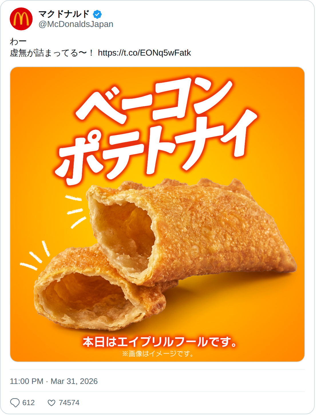 マクドナルド@McDonaldsJapan投稿日: 2026年4月1日 08:00 JSTID: 2039115525033275691