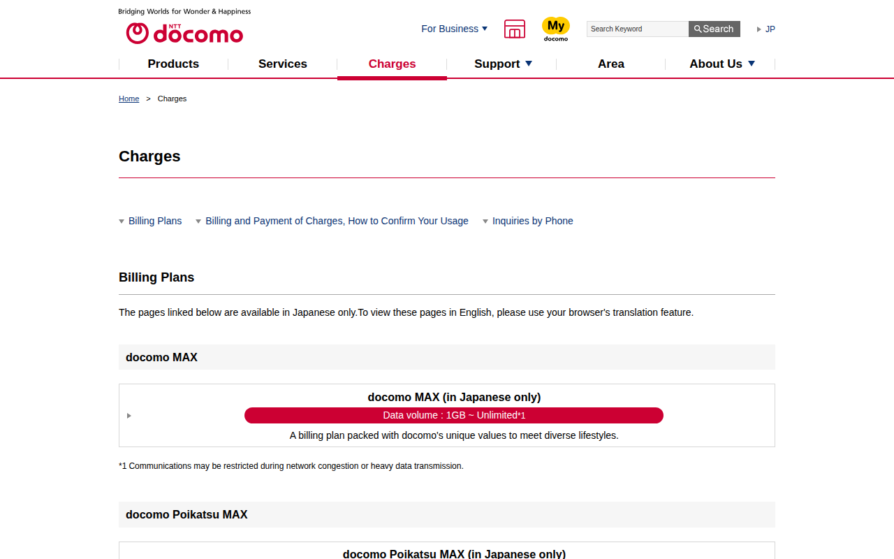 https://www.docomo.ne.jp/english/charge?icid=CRP_en_TOP_to_CRP_en_CHA2026年4月12日 10:28 JST•アーカイブページ・viewer・ダウンロードは、この保存版を基準に表示されます。