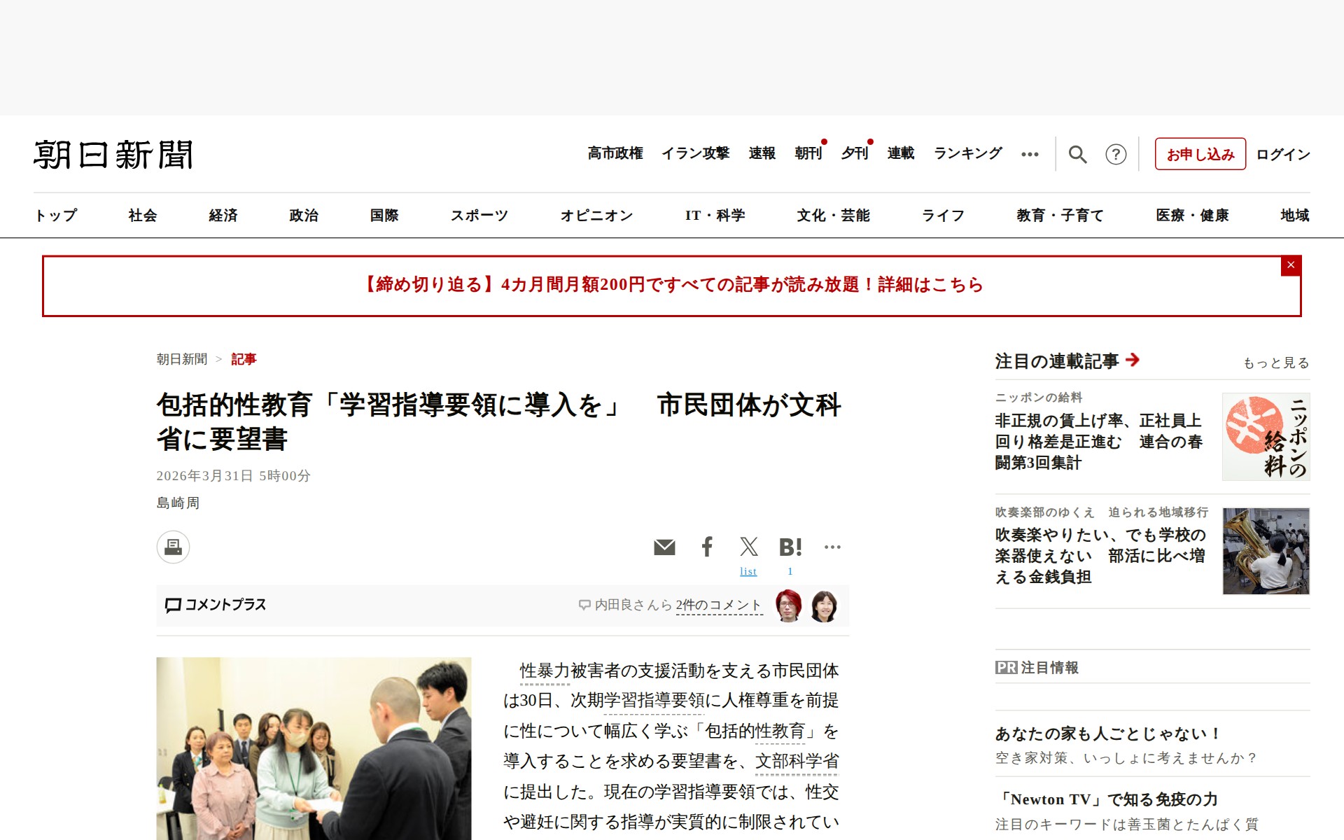 包括的性教育「学習指導要領に導入を」 市民団体が文科省に要望書:朝日新聞