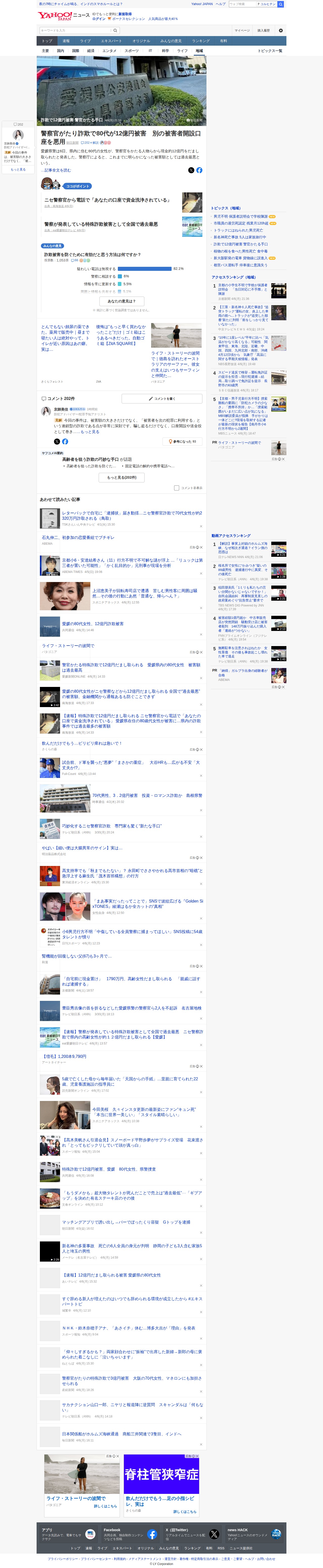 このページは、愛媛県に住む80代女性が警察官をかたる詐欺で約12億円をだまし取られたニュースを報じています。警察庁によると、これは特殊詐欺被害として過去最悪の被害額です。犯人らは電話で「あなたの口座で資金洗浄されている」と嘘をつき、被害者の口座を悪用した連鎖型詐欺の手口を使用。金融機関からの通報があったにもかかわらず被害を防げませんでした。記事ではコメント欄で詐欺防止策についてのアンケートも実施されており、疑わしい電話を無視することが最も有効だと考える人が82.1%です。