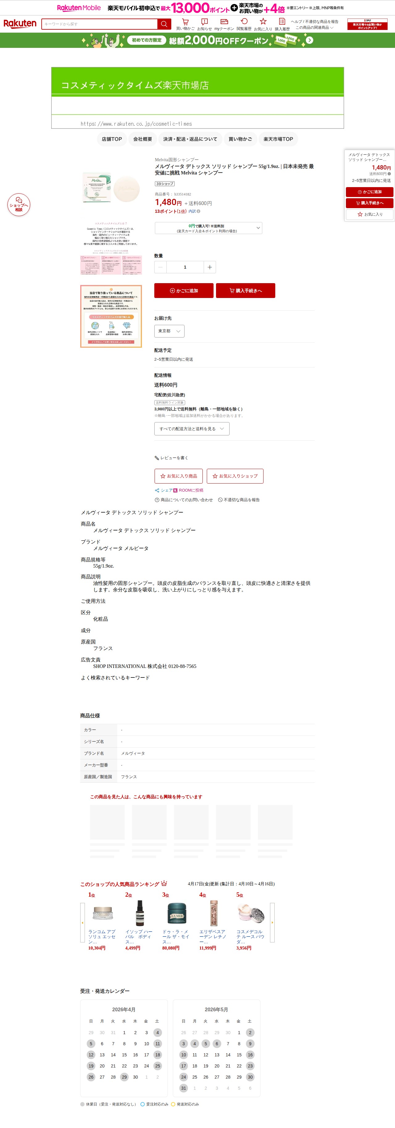 このページはメルヴィータのデトックス ソリッド シャンプー55gを販売する楽天市場の商品ページです。価格は1,480円で、送料は600円(3,980円以上で送料無料)。フランス製の油性髪用固形シャンプーで、頭皮の皮脂バランスを整え、余分な皮脂を吸収しながら洗い上がりにしっとり感を与えます。日本未発売の商品で、2~5営業日以内に発送予定です。