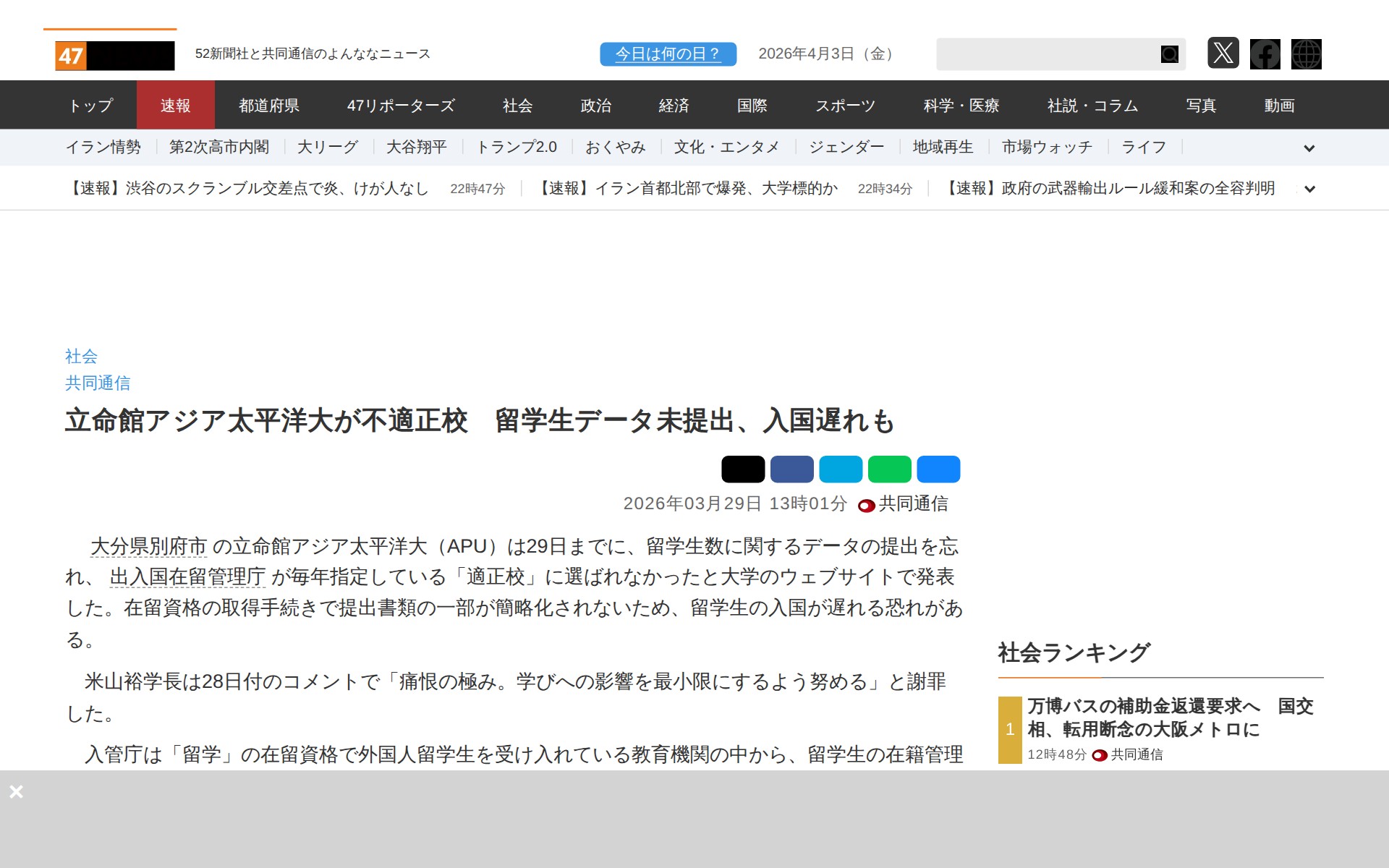 立命館アジア太平洋大が不適正校 留学生データ未提出、入国遅れも|47NEWS(よんななニュース)