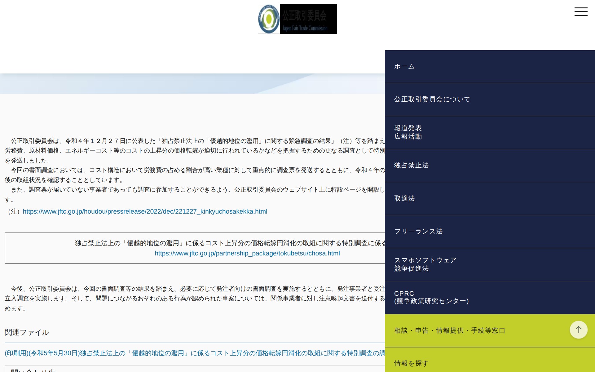(令和5年5月30日)独占禁止法上の「優越的地位の濫用」に係るコスト上昇分の価格転嫁円滑化の取組に関する特別調査の調査票の発送開始及び積極的な情報提供のお願いについて | 公正取引委員会
