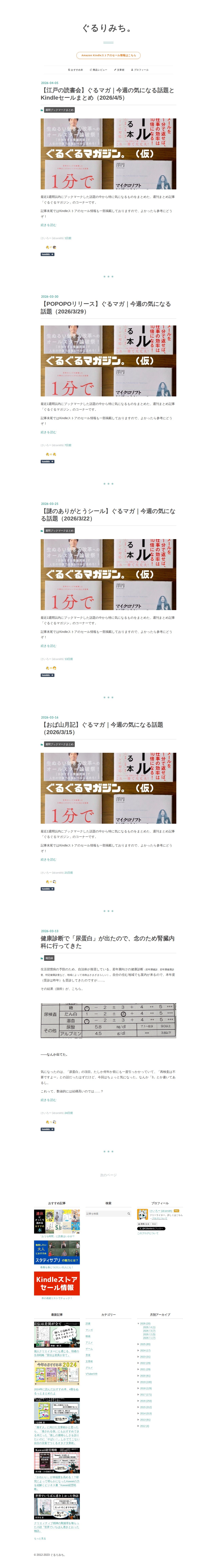 このページは、フリーライターのけいろーが運営するブログ「ぐるりみち。」です。週刊まとめ記事「ぐるぐるマガジン」で、最近1週間のブックマーク話題とKindleセール情報を紹介しています。また、読書、マンガ、映画、アニメなど多様なコンテンツレビューや文章術に関する記事を掲載。健康診断で尿蛋白が検出された経験を綴った記事や、おすすめ本の紹介など、生活と読書に関する多くのコンテンツを提供しています。