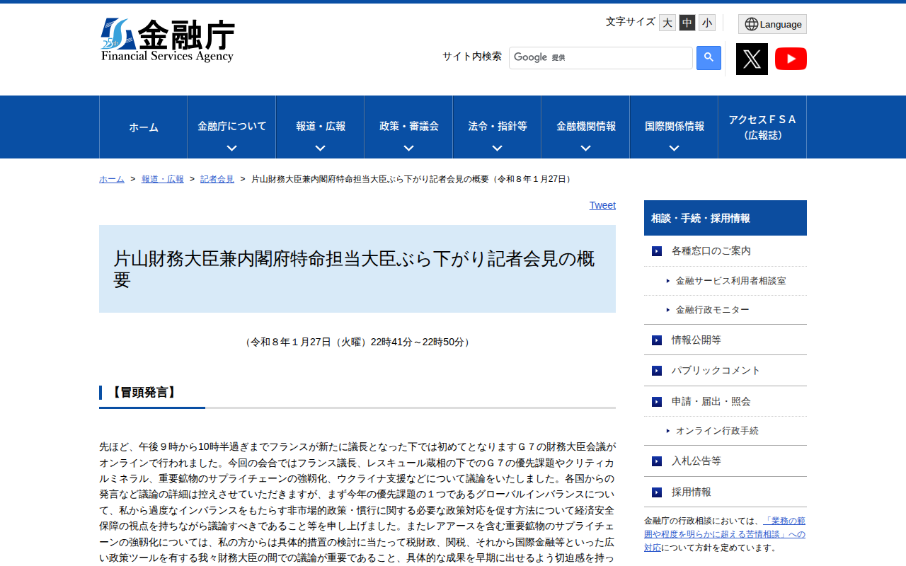 片山財務大臣兼内閣府特命担当大臣ぶら下がり記者会見の概要(令和8年1月27日):金融庁