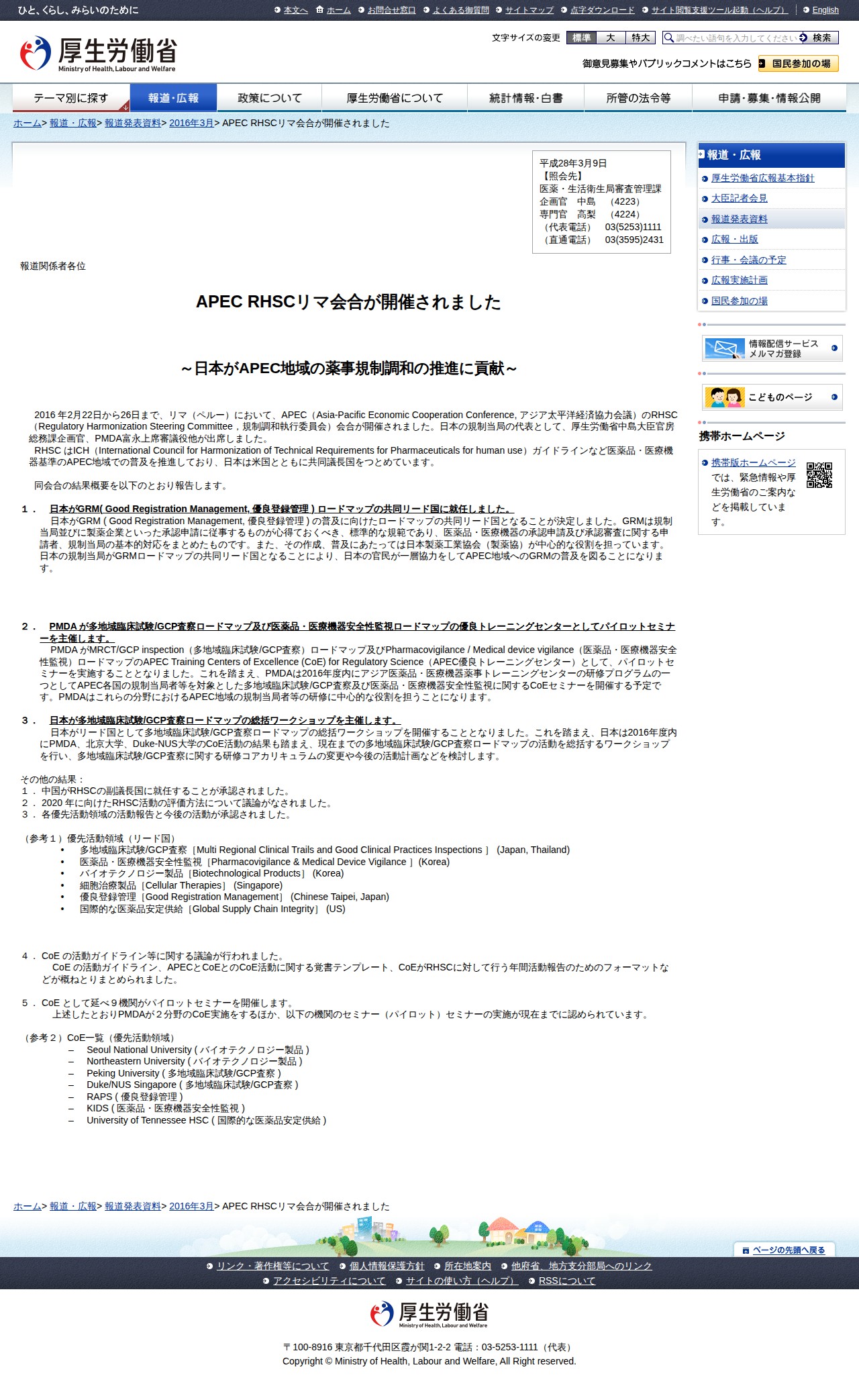 APEC RHSCリマ会合が開催されました |報道発表資料|厚生労働省 - 保存されたスクリーンショット