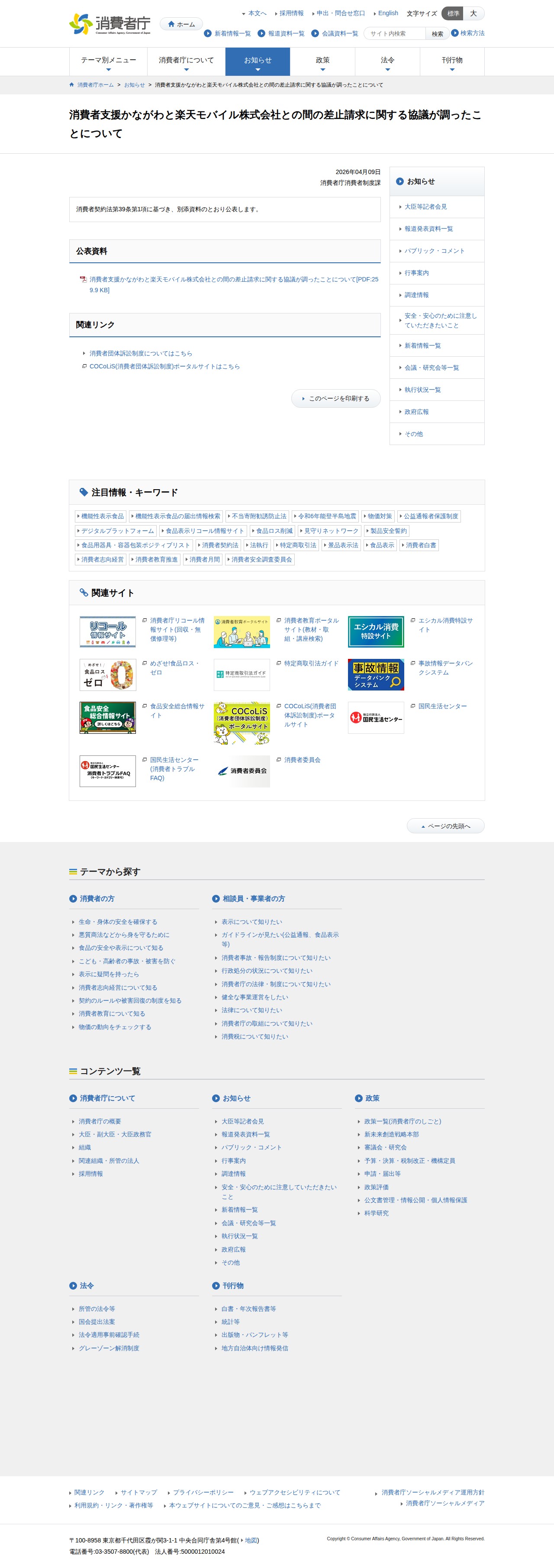 このページは、消費者支援かながわと楽天モバイル株式会社との間で、消費者契約法第39条第1項に基づく差止請求に関する協議が成立したことを公表するものです。2026年4月9日に消費者庁消費者制度課によって発表され、詳細は別添のPDF資料に記載されています。消費者団体訴訟制度に関する情報も提供されており、COCoLiSポータルサイトで関連情報を確認できます。