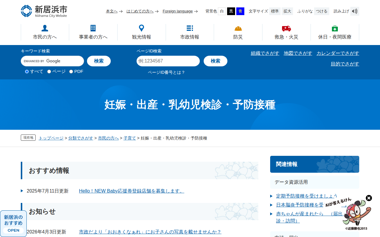 妊娠・出産・乳幼児検診・予防接種 - 愛媛県新居浜市ホームページ|四国屈指の臨海工業都市 - 保存されたスクリーンショット