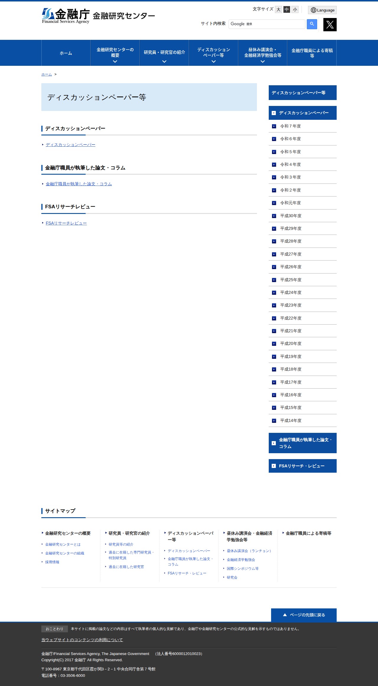 このページは、金融庁の金融研究センターが公開するディスカッションペーパーや研究成果物についての情報を提供しています。ディスカッションペーパー、金融庁職員による論文・コラム、FSAリサーチレビューなどが掲載されており、平成15年度から令和7年度までの各年度の研究成果を閲覧できます。また、研究員・研究官の紹介、昼休み講演会や金融経済学勉強会などのイベント情報も掲載しています。なお、掲載される論文などの内容は執筆者の個人的見解であり、金融庁の公式見解ではないことが明記されています。