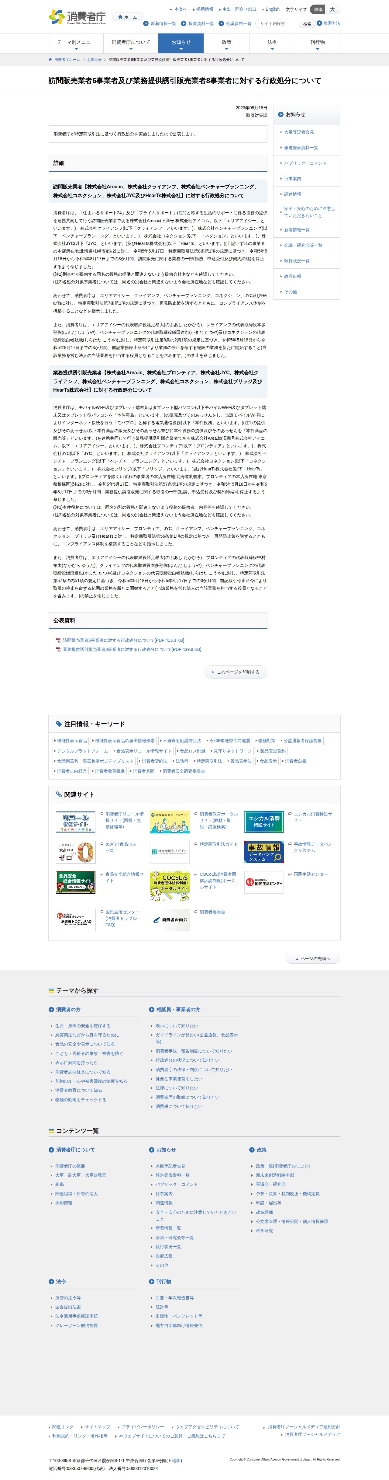 このページは、消費者庁が2023年5月18日に実施した行政処分について公表しています。訪問販売業者6事業者(エリアアイシー、クライアンフ、ベンチャープランニング、コネクション、JYC、HearTs)に対して、特定商取引法に基づき3ヶ月間の業務停止を命じました。また業務提供誘引販売業者8事業者に対しても同様に業務停止命令を実施しています。これらの事業者は生活支援役務やモバイルWi-Fi関連商品・役務の販売で違法行為があったとされています。