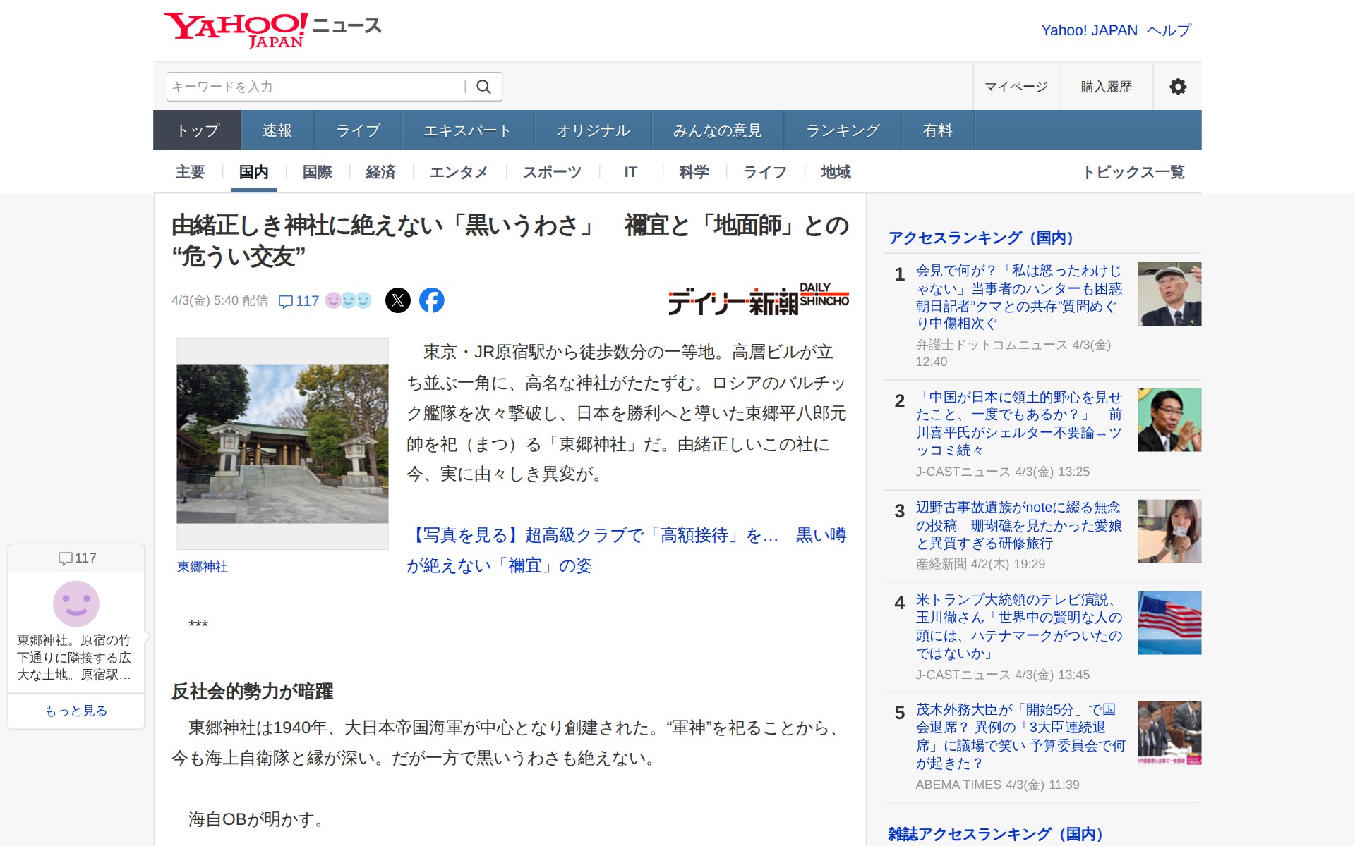 このページは、東京・原宿の東郷神社における不正疑惑を報じた記事である。由緒正しい神社が、不動産ブローカーや反社会的勢力の暗躍に直面しており、さらに禰宜の田村武氏が詐欺グループに属するX氏と親密な関係にあったことが明かされている。X氏は神社の同意書を不正利用した不動産取引に関与し、また氷室権宮司を銀座の超高級クラブで接待。神社側は経営会社「東日」を排除する動きを見せており、この権力闘争が神社内の深刻な問題として浮き彫りになっている。