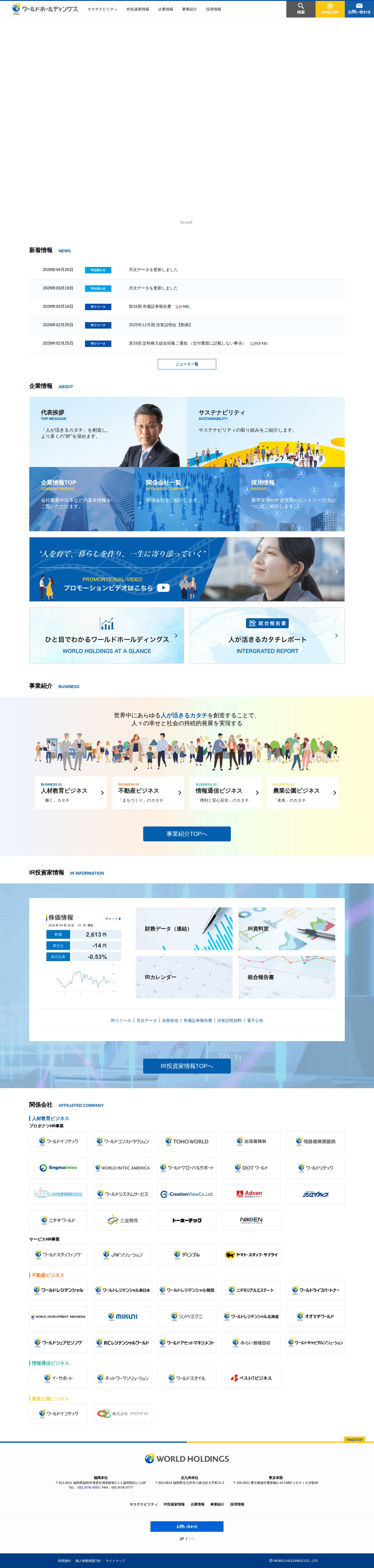 このページは、株式会社ワールドホールディングスの企業情報サイトです。人材教育、不動産、情報通信、農業公園の4つの事業を展開し、「人が活きるカタチ」を創造することで社会の持続的発展を実現することを目指しています。サステナビリティ、IR投資家情報、企業情報、採用情報などの各セクションを備えており、最新のIRリリースや月次データ、決算説明会動画などを提供しています。福岡、北九州、東京に本社・本部を置いています。