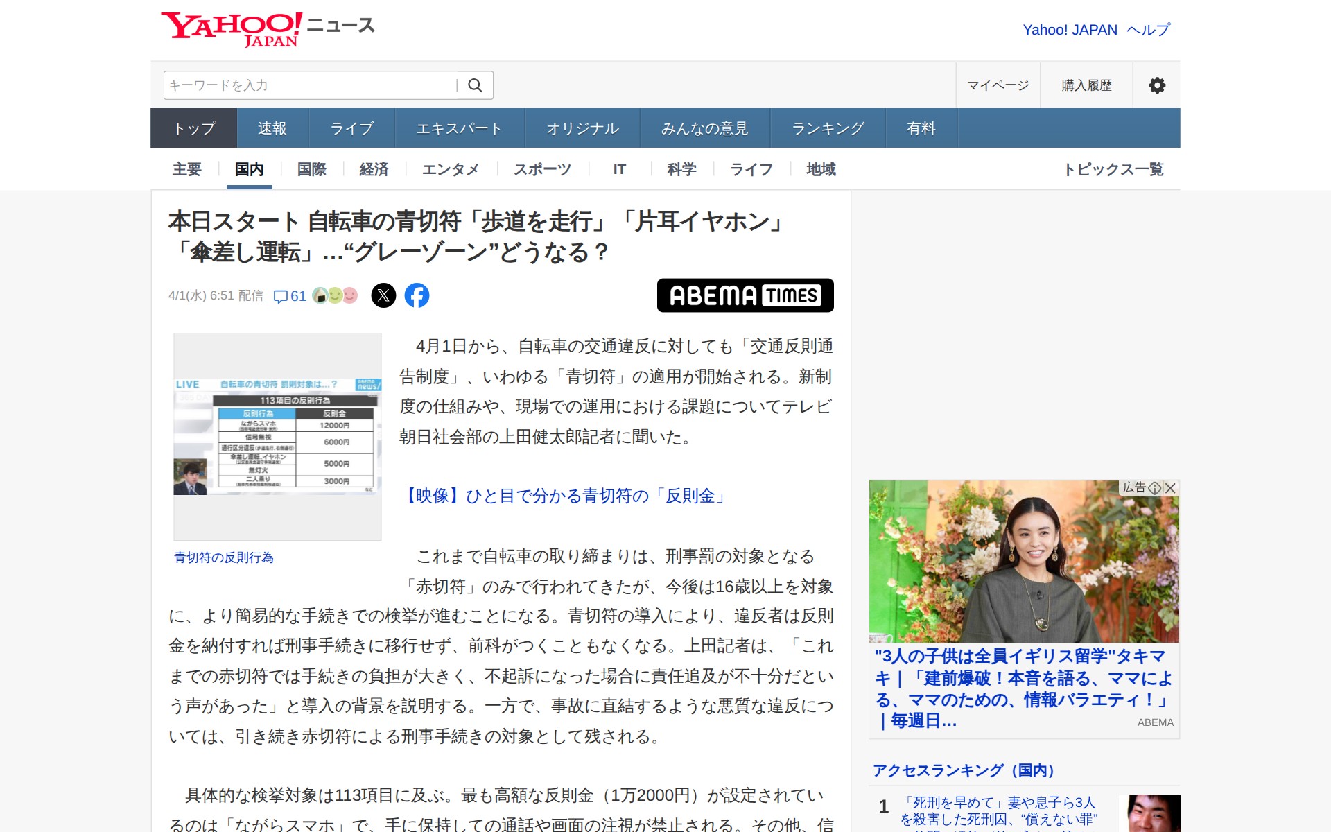 本日スタート 自転車の青切符「歩道を走行」「片耳イヤホン」「傘差し運転」…“グレーゾーン”どうなる?(ABEMA TIMES) - Yahoo!ニュース