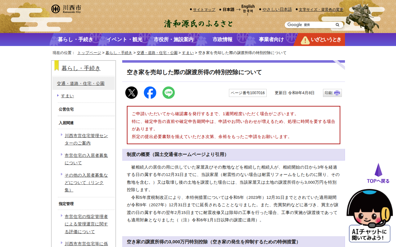 空き家を売却した際の譲渡所得の特別控除について|川西市