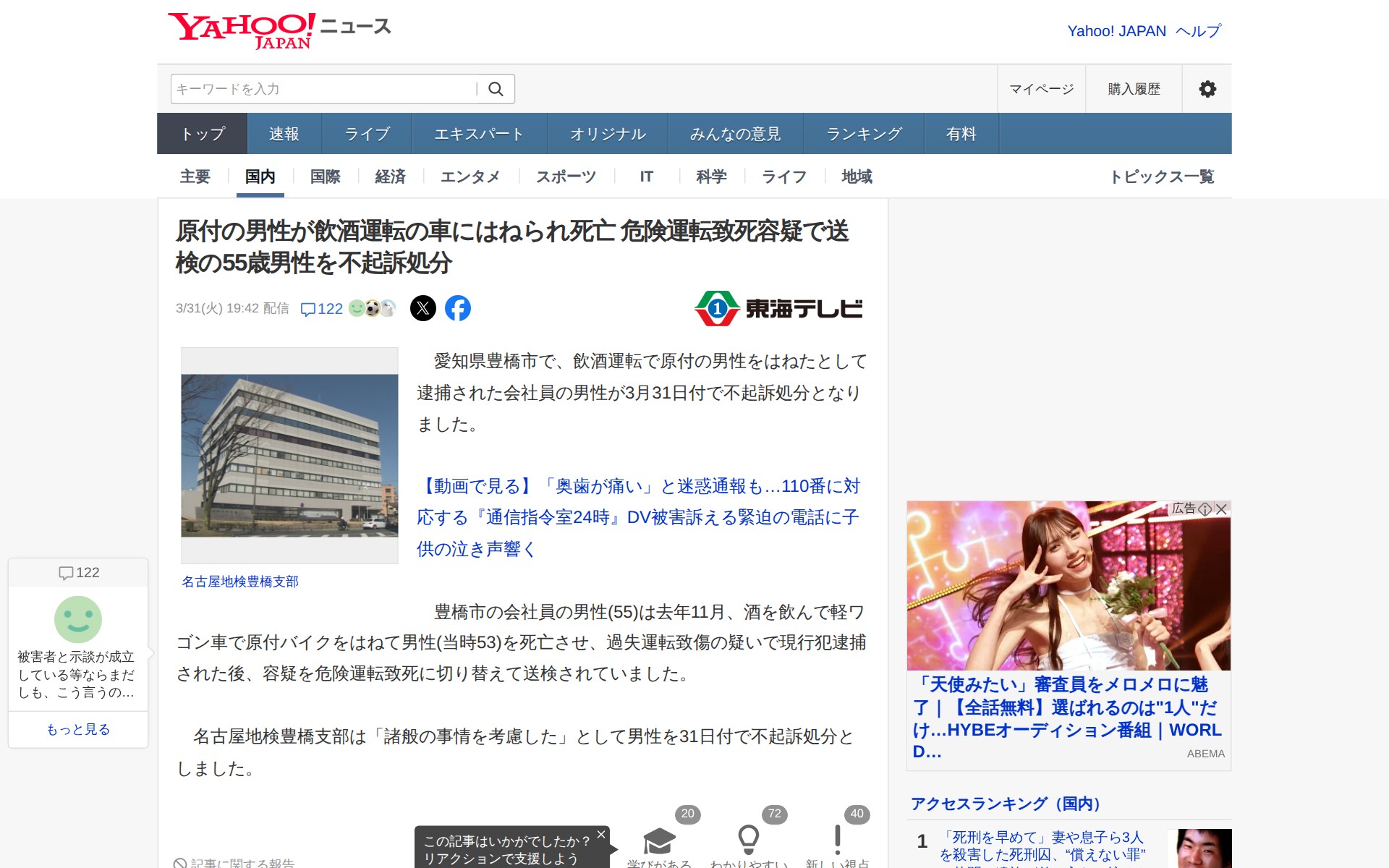 このページは、愛知県豊橋市で飲酒運転により原付バイクの男性(当時53歳)を死亡させた会社員の男性(55歳)が、3月31日付で不起訴処分となったことを報じています。男性は去年11月の事件後、過失運転致傷容疑で現行犯逮捕されましたが、その後危険運転致死容疑に切り替えられて送検されていました。名古屋地検豊橋支部は「諸般の事情を考慮した」として不起訴としましたが、具体的な理由は明示されていません。