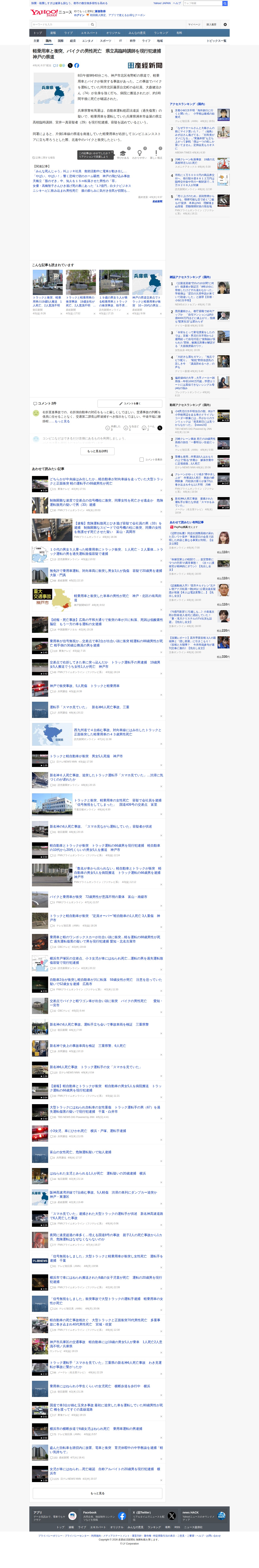 軽乗用車と衝突、バイクの男性死亡 県立高臨時講師を現行犯逮捕 神戸の県道(産経新聞) - Yahoo!ニュース - 保存されたスクリーンショット