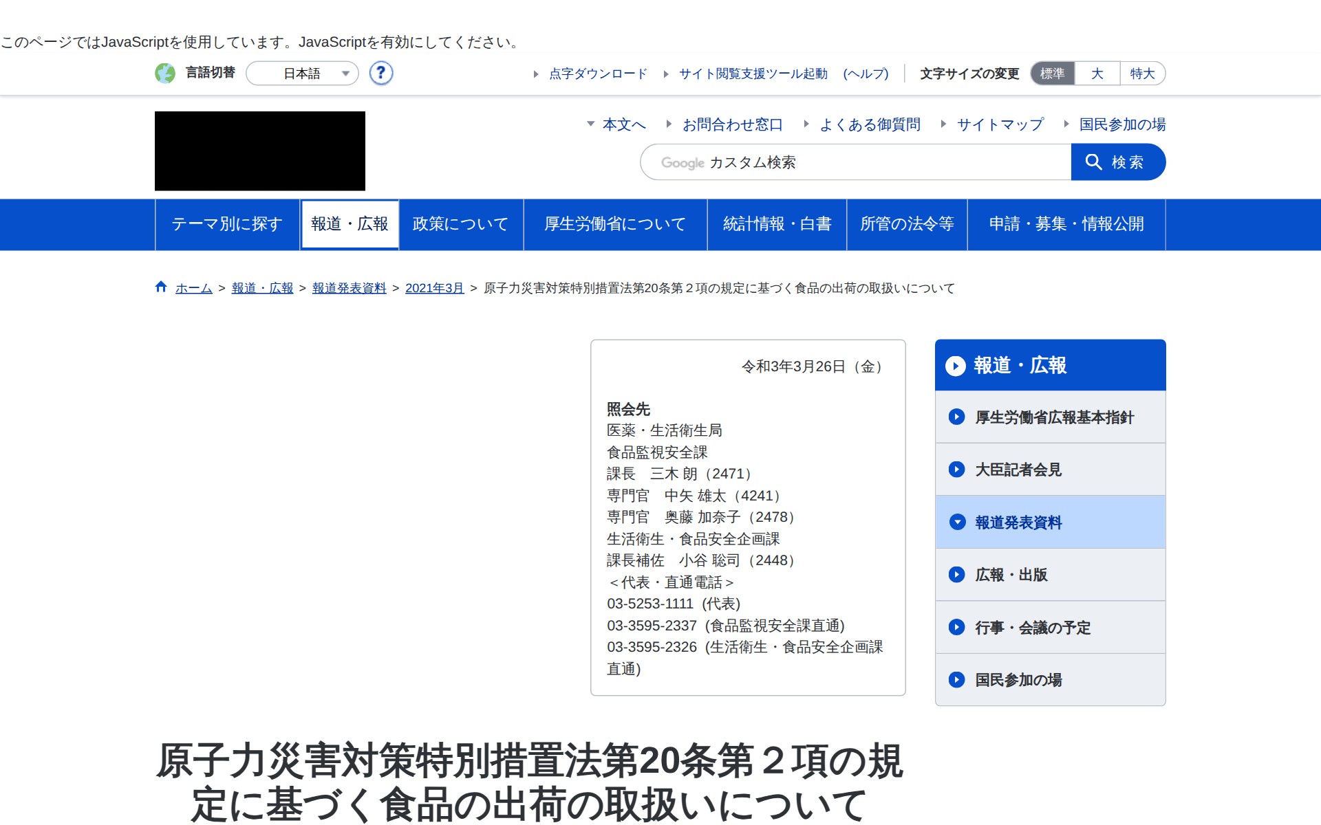 原子力災害対策特別措置法第20条第2項の規定に基づく食品の出荷の取扱いについて|厚生労働省