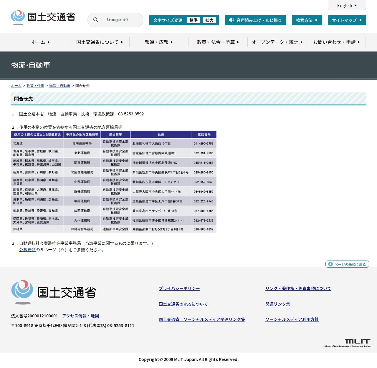 物流・自動車:問合せ先 - 国土交通省