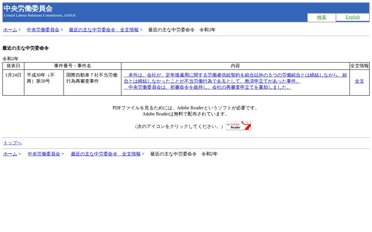 このページは厚生労働省中央労働委員会の令和2年における主な命令を掲載しています。1月24日に公表された国際自動車7社不当労働行為再審査事件では、会社が定年後雇用に関する労働者供給契約を組合以外の5つの労働組合とは締結しながら、当該組合とは締結しなかったことが不当労働行為と判断されました。中央労働委員会は初審命令を維持し、会社の再審査申立てを棄却しました。各命令の全文はPDF形式で提供されています。
