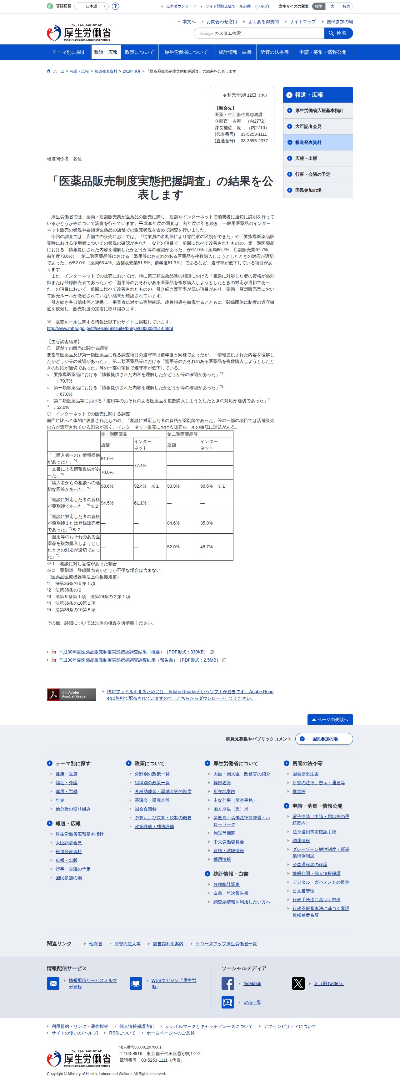 このページは、厚生労働省が「医薬品販売制度実態把握調査」の結果を公表した内容をまとめています。調査では、薬局や店舗販売業が医薬品の販売時に消費者に適切な説明を行っているかを確認しました。店舗での販売については、一部の遵守率が低下しており、特に第一類医薬品に関する情報提供の理解確認が67.0%、第二類医薬品での複数購入時の対応が52.0%に留まっています。また、インターネット販売においてもルール徹底に課題があり、相談に対応した者の資格や対応の適切性に関して改善が必要とされています。厚生労働省は、引き続き事業者への改善指導を行い、販売制度の定着に努める意向を示しています。