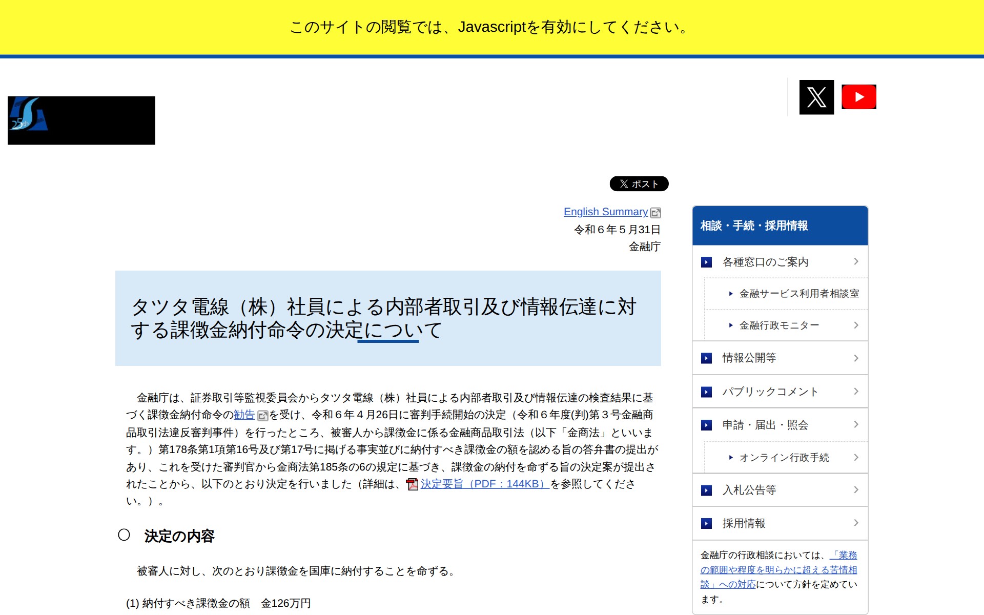 このページは、金融庁がタツタ電線株式会社の社員による内部者取引及び情報伝達に対する課徴金納付命令の決定を発表したものです。証券取引等監視委員会の検査結果に基づき、金融商品取引法違反として課徴金納付命令が決定されました。被審人が違反事実と納付額を認める答弁書を提出したことを受け、審判官から課徴金納付命令案が提出され、決定が行われました。納付すべき課徴金は126万円で、納付期限は令和6年7月31日です。