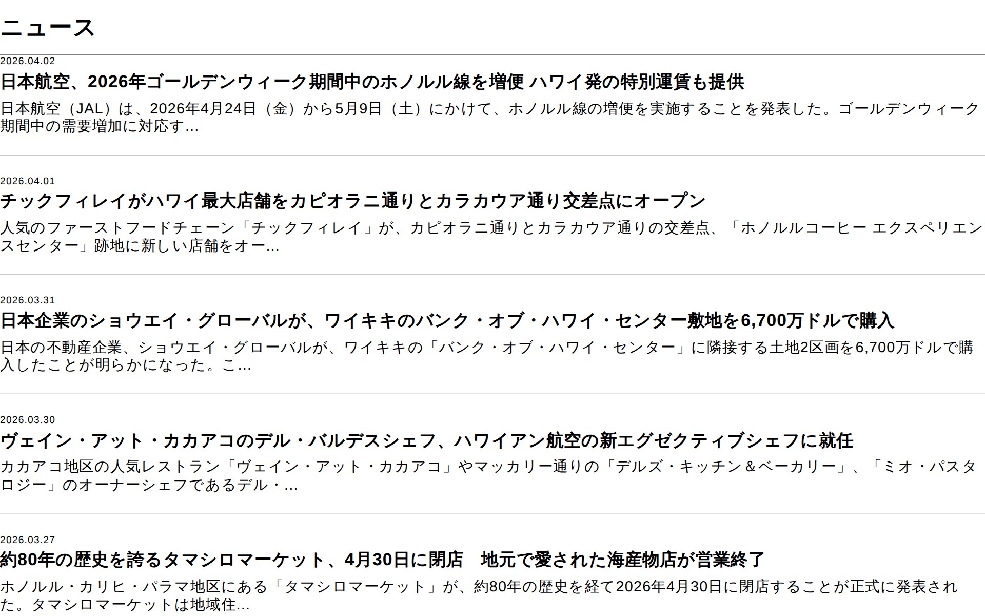 このページは、ハワイに関する最新ニュースを掲載するニュースセクションである。日本航空のホノルル線増便、チックフィレイの新店舗オープン、日本企業による不動産購入、レストランシェフの就職、老舗海産物店の閉店、銃の買い取りイベント、百貨店の閉店、災害支援要請、ピザチェーンの撤退、暴風雨による公共施設閉鎖など、2026年3月から4月のハワイの様々なニュースが掲載されている。不動産、飲食業、雇用、気象災害など多岐にわたるトピックスをカバーしている。