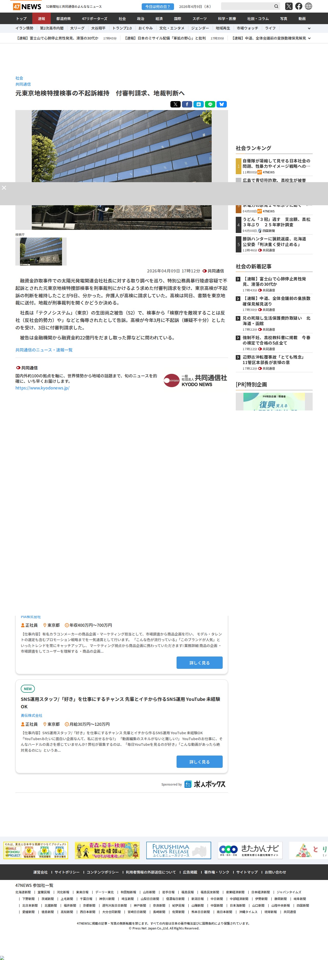 このページは、融資金詐取事件の取り調べを巡り特別公務員暴行陵虐容疑で不起訴とされた元東京地検特捜部検事について、東京高検が不起訴の判断を維持したことを報じています。被告人の弁護人が付審判請求をしていたもので、高検は書類を東京地裁に送付しました。地裁が刑事裁判を開くかどうかを判断することになります。被告は太陽光発電関連会社の社長で、検事からの侮辱発言を告訴していました。