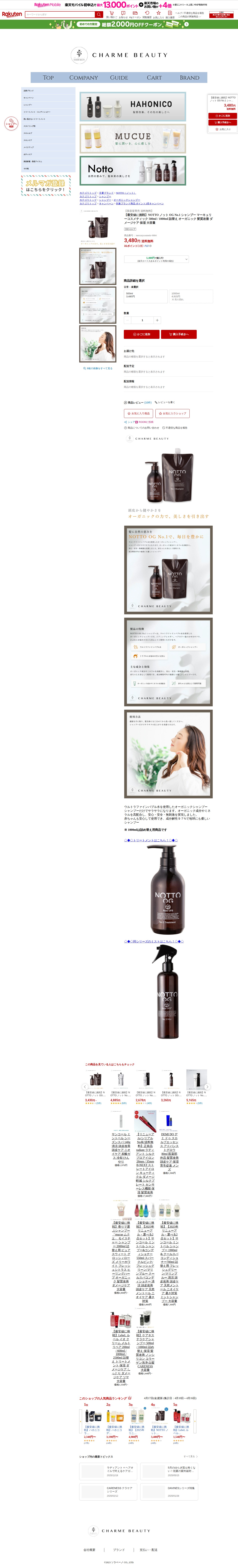 このページは、楽天市場で販売されているNOTTO(ノット)OG No.1シャンプーの商品紹介ページです。マーキュリーコスメティック製で、500ml(3,480円)と1000ml詰替え(4,915円)のサイズから選択できます。ウルトラファインバブル水を使用したオーガニックシャンプーで、オーガニック成分やミネラルを高配合しています。シャンプーだけでサラサラになり、赤ちゃんも安心して使用でき、成分解性97%で環境に優しいのが特徴です。送料無料で、ポイント2倍キャンペーン対象商品となっています。