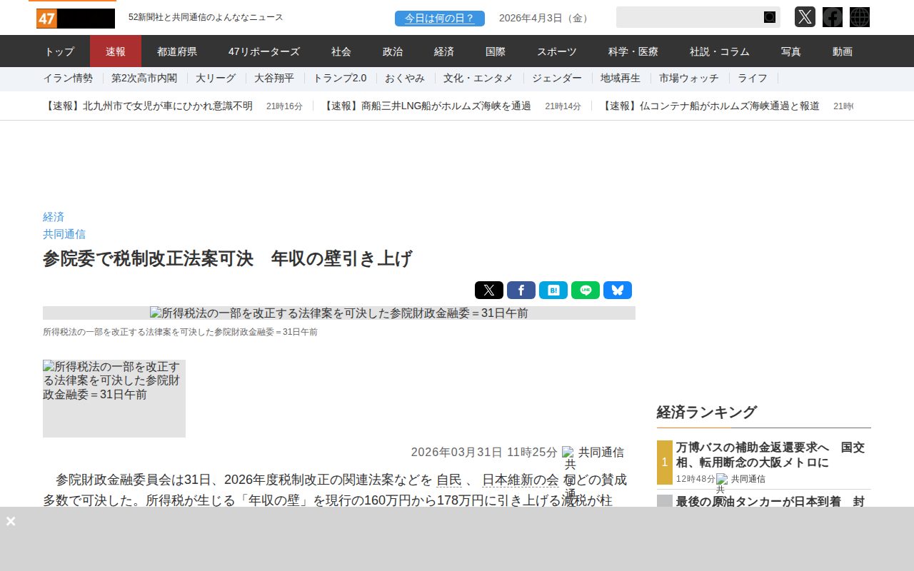 参院委で税制改正法案可決 年収の壁引き上げ|47NEWS(よんななニュース) - 保存されたスクリーンショット