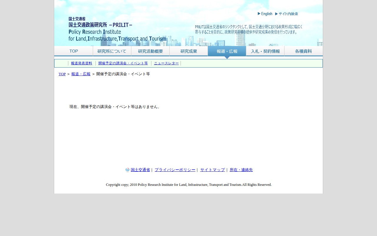 このページは、国土交通政策研究所の公式ウェブサイトの報道・広報セクションであり、開催予定の講演会やイベント等に関する情報を提供するものです。現在のところ、開催予定の講演会やイベント等はありません。サイトには研究所概要、研究活動、研究成果、報道発表資料、ニュースレターなどの関連情報へのリンクが掲載されています。