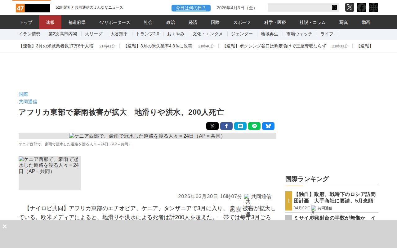 このページはアフリカ東部で発生した豪雨災害についてのニュースである。エチオピア、ケニア、タンザニアで3月に豪雨による地滑りと洪水が発生し、200人以上が死亡した。エチオピア南部では125人以上、ケニアのナイロビなどでは88人が死亡し、3万4千人以上が避難した。タンザニア南部でも20人が死亡している。毎年3月ごろからの雨期に水害が頻発しており、ナイロビでは排水施設の不備が被害拡大の原因として指摘されている。