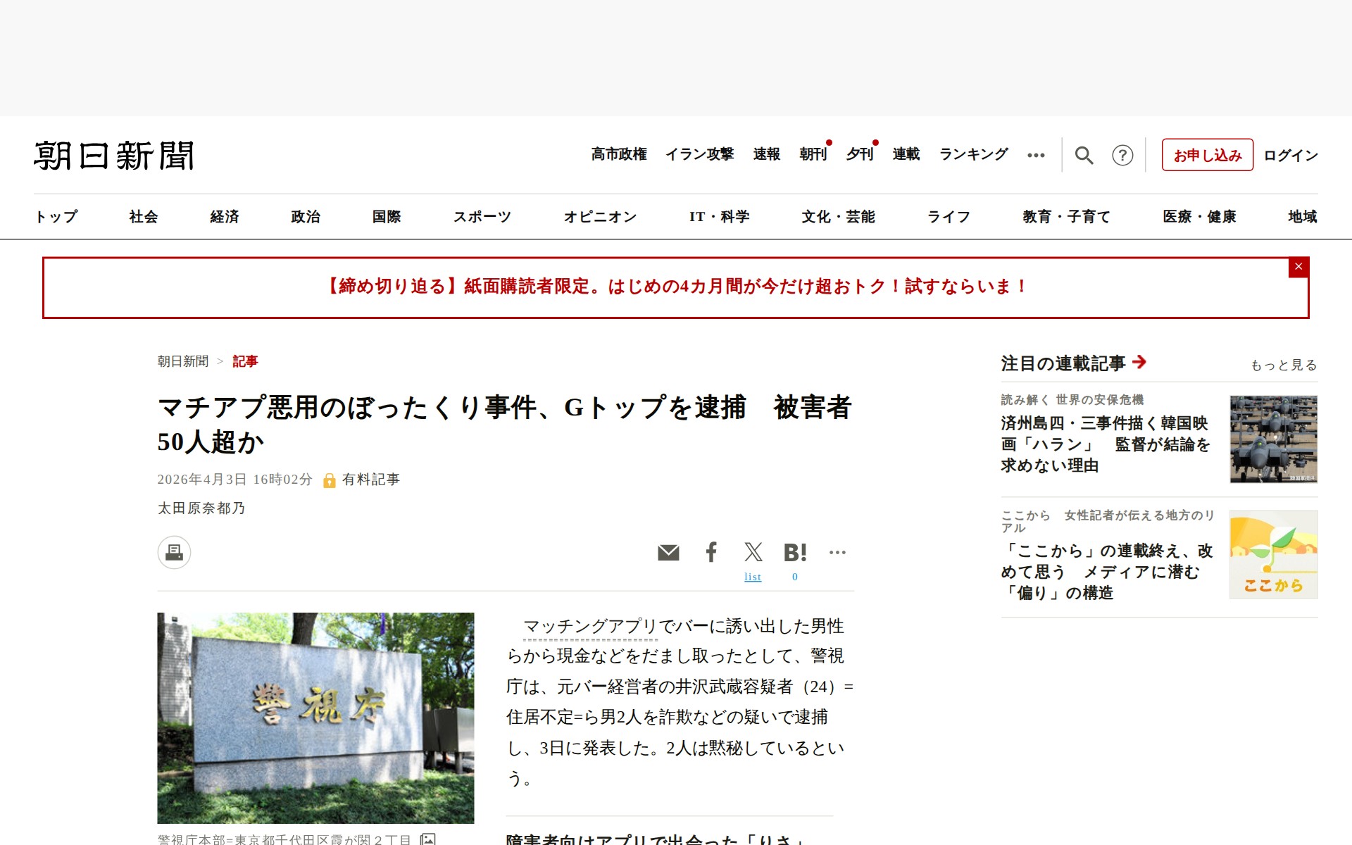 ![マチアプ悪用のぼったくり事件、Gトップを逮捕 被害者50人超か [東京都]:朝日新聞 - 保存されたスクリーンショット](https://pub-f6fa8ca7bebe4069bff3224f9a8f5334.r2.dev