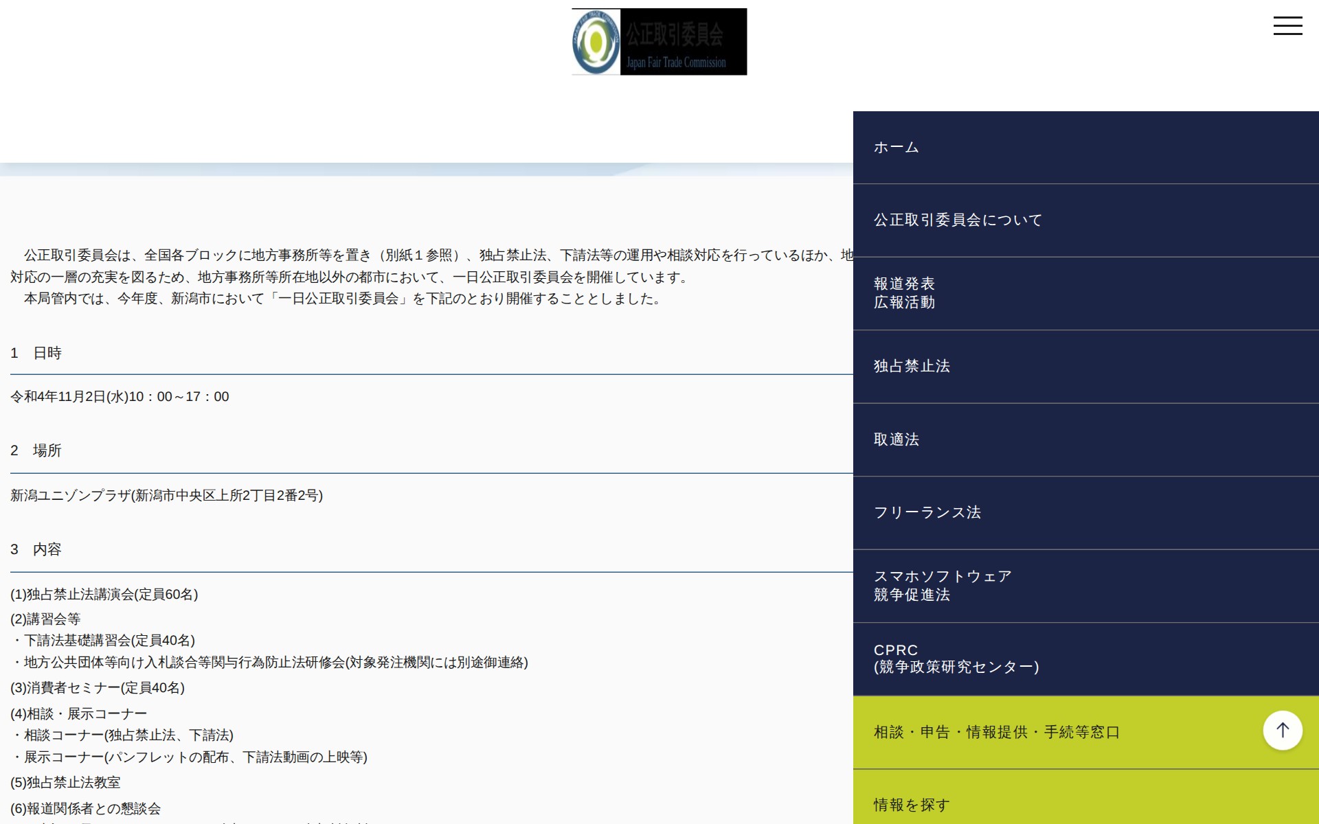このページは、公正取引委員会が令和4年11月2日に新潟市で開催する「一日公正取引委員会」についての案内です。独占禁止法講演会、下請法基礎講習会、消費者セミナー、相談・展示コーナー、独占禁止法教室などが予定されています。講演会とセミナーは参加料無料で誰でも参加でき、10月31日までにホームページから申し込みが必要です。相談コーナー以外は取材可能で、事前連絡で対応されます。