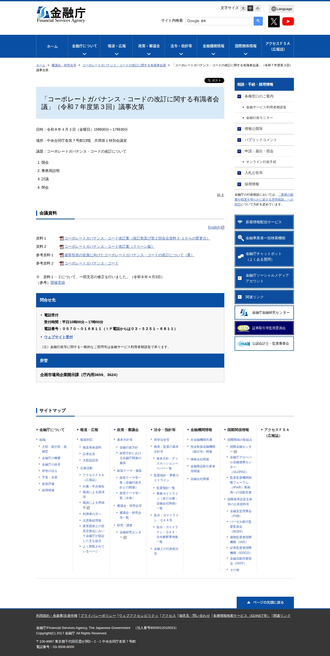 「コーポレートガバナンス・コードの改訂に関する有識者会議」(令和7年度第3回)議事次第:金融庁 - 保存されたスクリーンショット