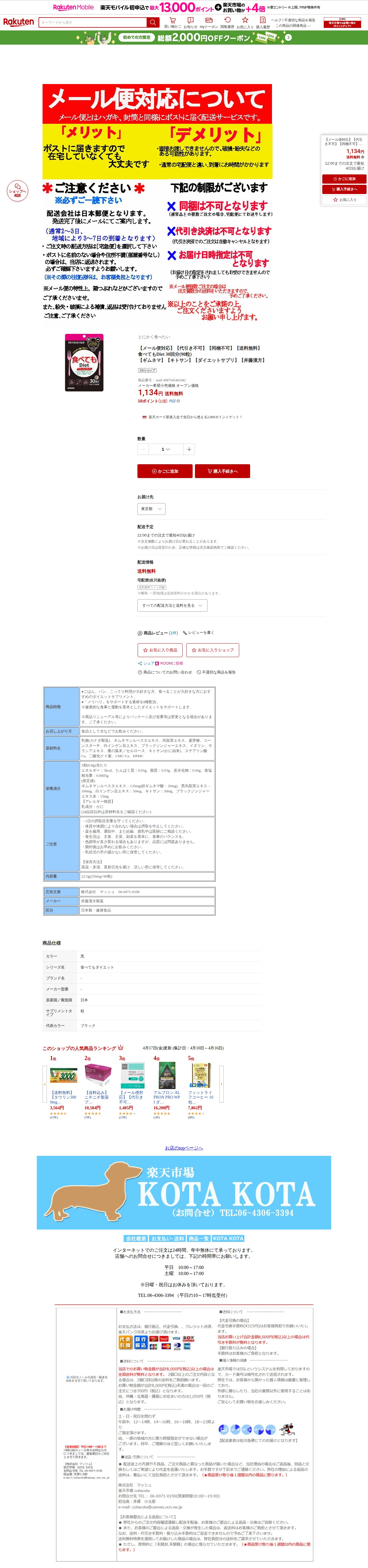 【楽天市場】【メール便対応】【代引き不可】【同梱不可】【送料無料】食べてもDiet 30回分(90粒)【ギムネマ】【キトサン】【ダイエットサプリ】【井藤漢方】:KOTAKOTA - 保存されたスクリーンショット