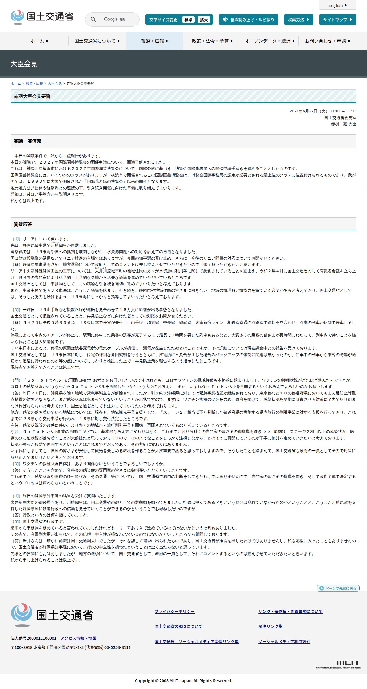大臣会見:赤羽大臣会見要旨 - 国土交通省
