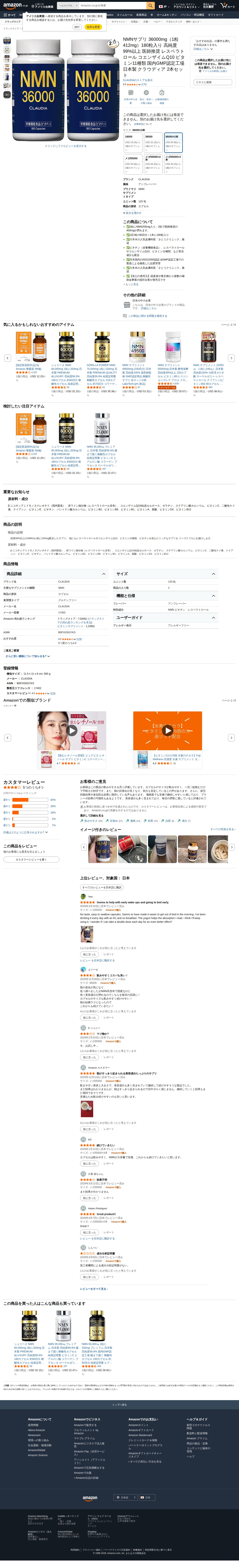 Amazon | NMNサプリ 36000mg(1粒412mg)180粒入り 高純度99%以上 医師推奨 レスベラトロール コエンザイムQ10 ビタミン11種類 国内GMP認定工場 日本製 クラウディア 2本セット | CLAUDIA | サプリメント・ビタミン - 保存されたスクリーンショット