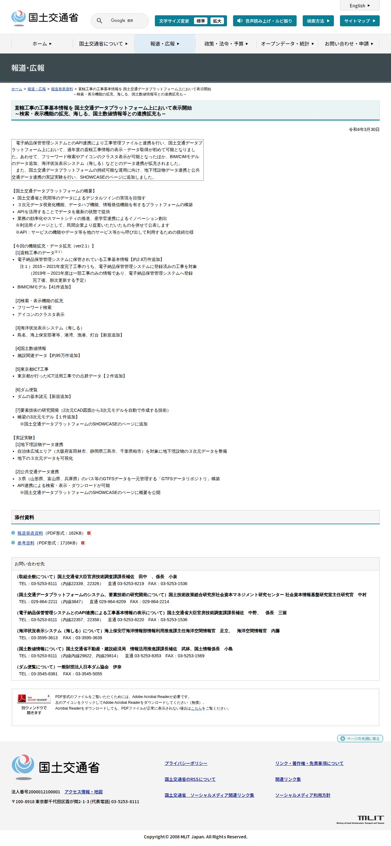 報道発表資料:直轄工事の工事基本情報を 国土交通データプラットフォーム上において表示開始<br>~検索・表示機能の拡充、海しる、国土数値情報等との連携拡充も~ - 国土交通省 - 保存されたスクリーンショット