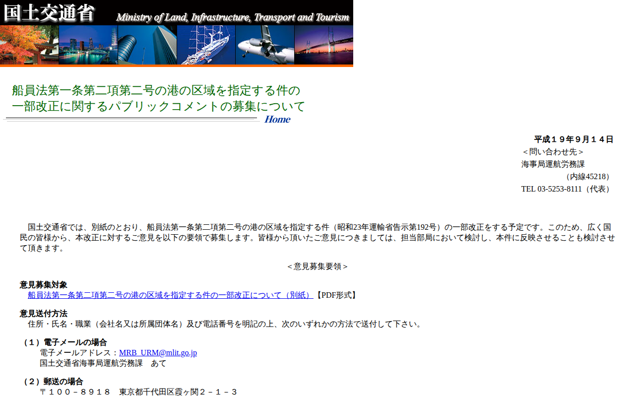 船員法第一条第二項第二号の港の区域を指定する件の一部改正に関するパブリックコメントの募集について - 保存されたスクリーンショット
