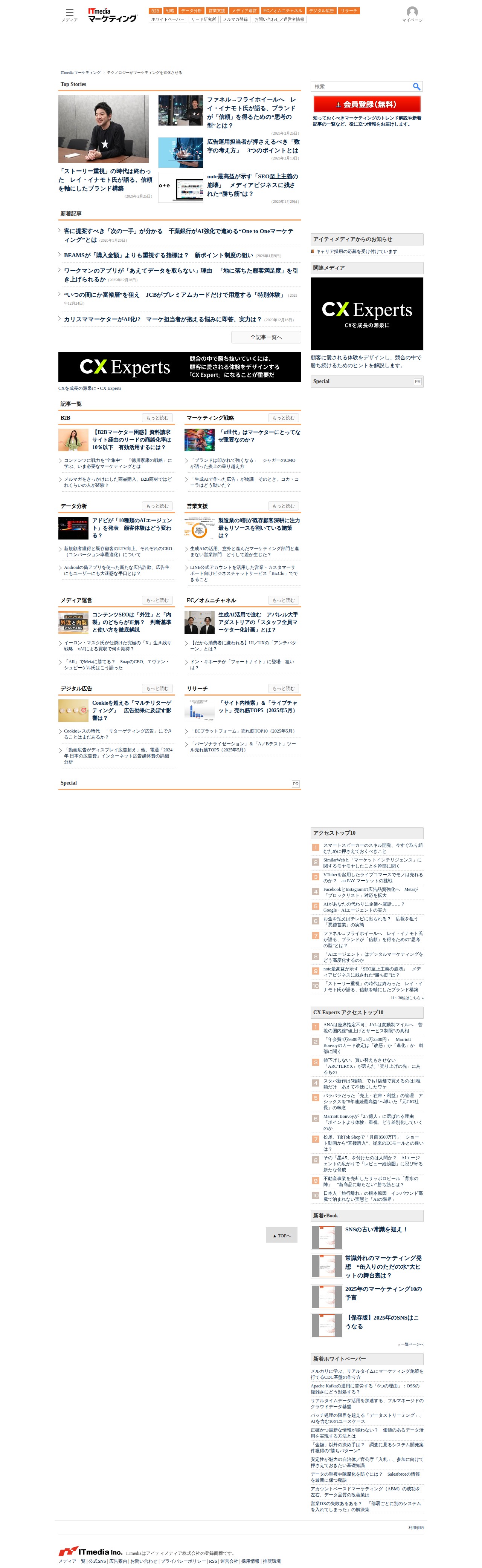 このページはITmedia マーケティングのポータルサイトであり、テクノロジーがマーケティングを進化させるというテーマで、B2B、戦略、データ分析、営業支援、メディア運営、EC/オムニチャネル、デジタル広告、リサーチなど多岐にわたるマーケティング関連の記事と情報を提供している。ブランド構築、AI活用、顧客体験(CX)向上などの最新トレンドや事例を取り上げ、マーケティング担当者向けのホワイトペーパーやツール情報も掲載している。