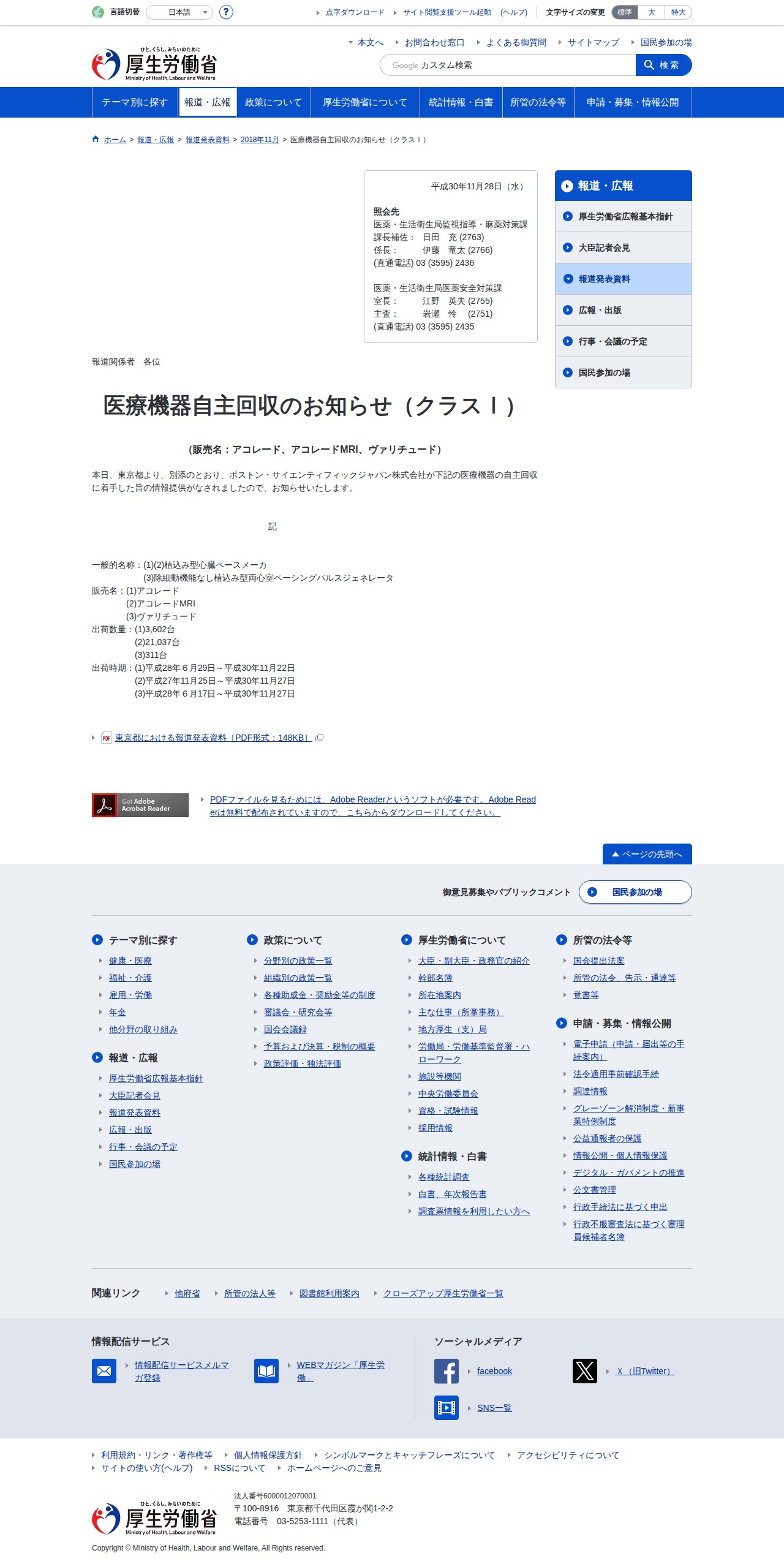 このページは、厚生労働省が2018年11月28日に発表した医療機器の自主回収に関する公式通知です。ボストン・サイエンティフィックジャパン株式会社が、植込み型心臓ペースメーカ「アコレード」「アコレードMRI」と除細動機能なし植込み型両心室ペーシングパルスジェネレータ「ヴァリチュード」の3製品について、クラスⅠの自主回収に着手したことを報告しています。出荷数量は合計24,950台で、出荷時期は2015年11月から2030年11月27日までの間です。