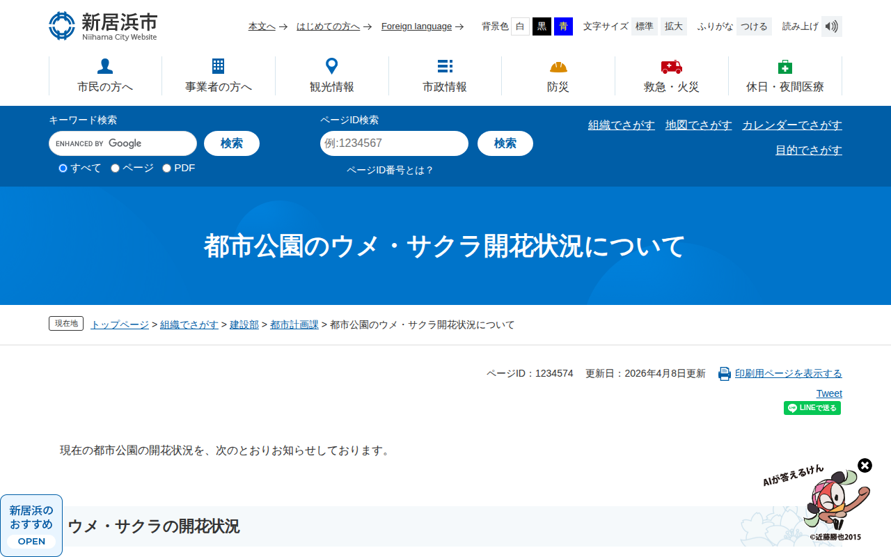都市公園のウメ・サクラ開花状況について - 愛媛県新居浜市ホームページ|四国屈指の臨海工業都市 - 保存されたスクリーンショット