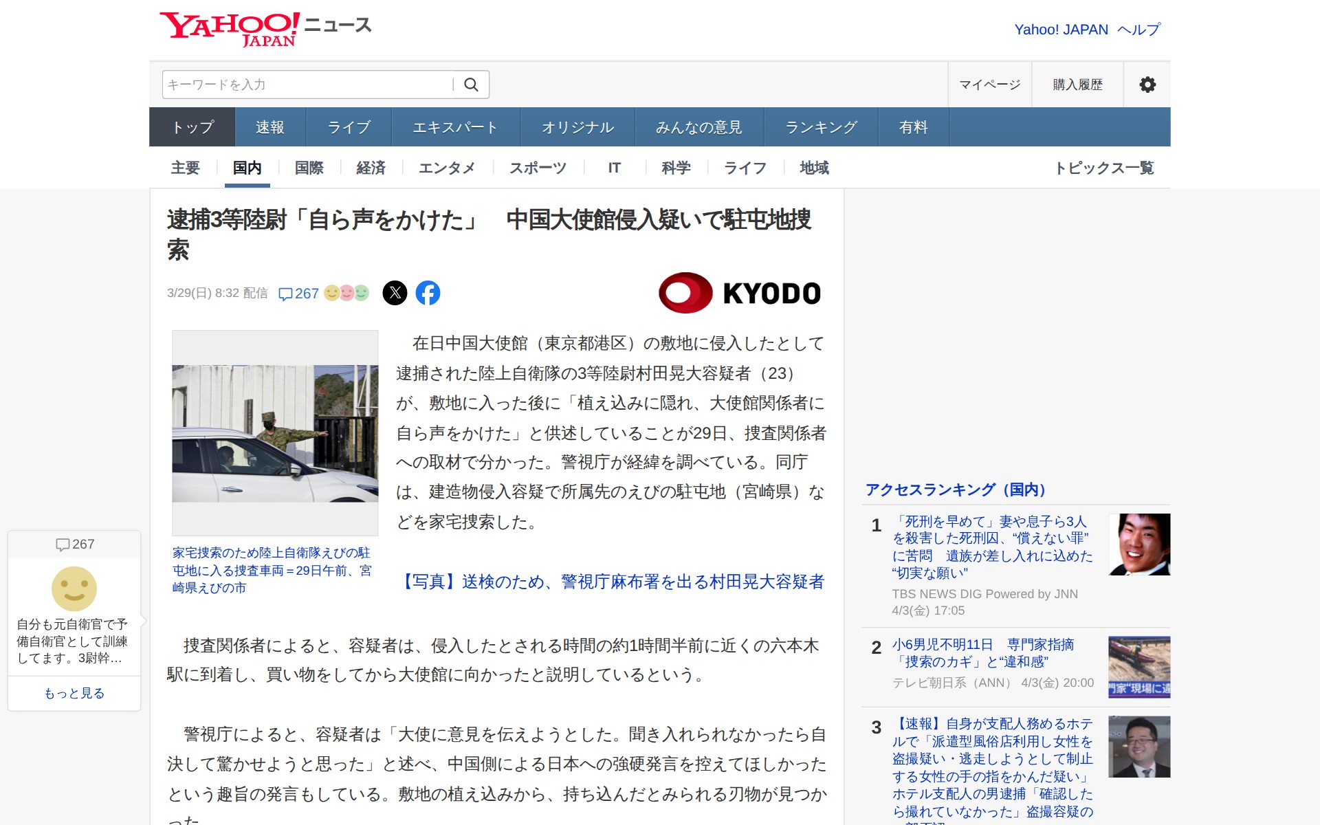 このページは、在日中国大使館の敷地に侵入したとして逮捕された陸上自衛隊3等陸尉村田晃大容疑者(23)に関する事件を報じている。容疑者は敷地内の植え込みに隠れた後、大使館関係者に自ら声をかけたと供述。中国側の強硬発言に反発し、大使に意見を伝えるつもりだったと述べ、聞き入れられなければ自決するつもりだったという。刃物も持ち込まれており、警視庁が経緯を調査中。所属する駐屯地の家宅捜索も実施された。